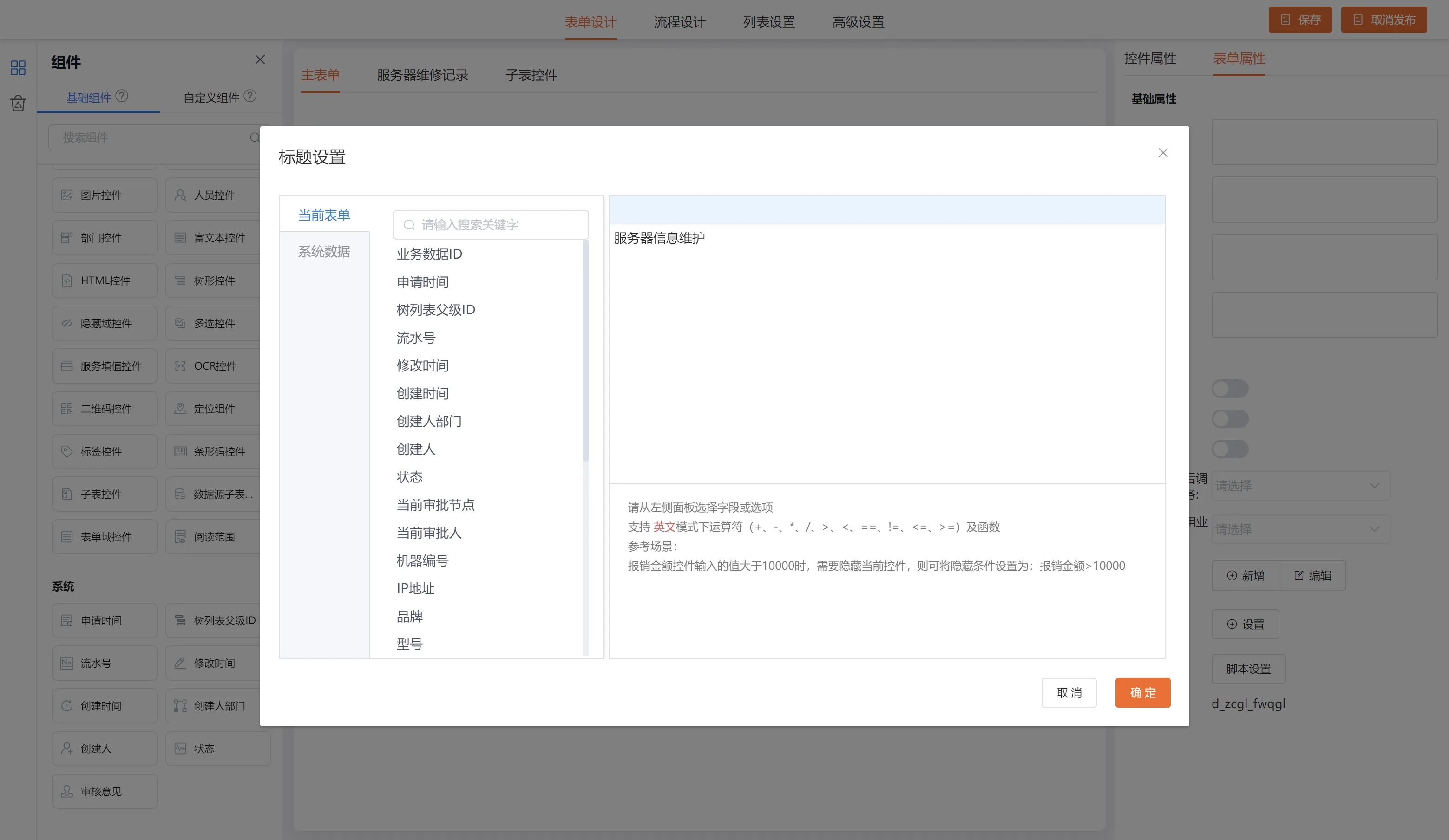 # 标题 ### 功能说明 是表单中数据的简要信息,类似于邮件的标题,可设置当前表单字段设为标题或自定义输入数据设为标题 ### 操作步骤 表单设计——右侧表单属性——标题  ### 前台列表显示效果  工作流待办消息标题显示: