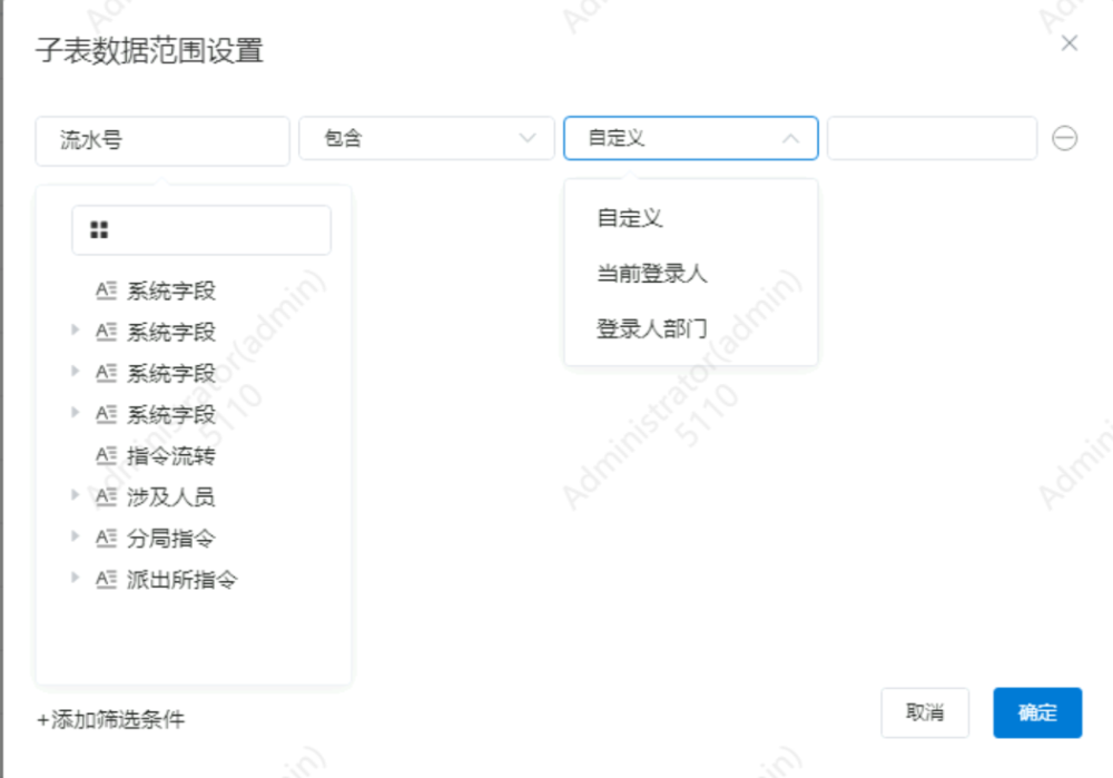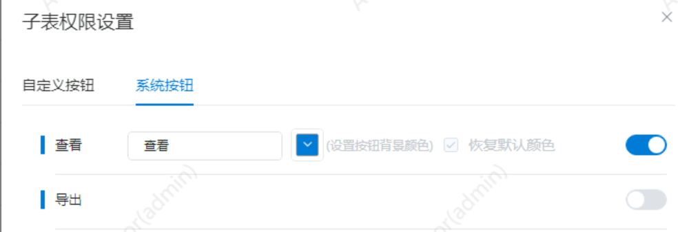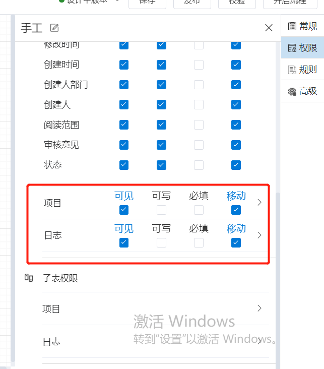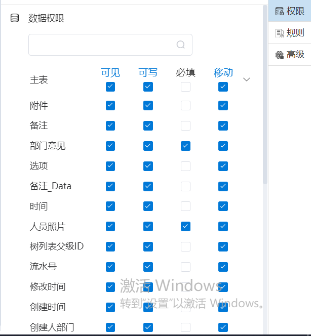 # 权限 > 设置当前节点表单字段的权限,包括(可见、可写、必填、移动看见)权限。 设置节点按钮的显示权限。 ## 数据权限 在\[流程设计]\-选中流程节点\-\[权限]中,可设置当前节点主表、子表字段的权限。  1\. 数据权限规则 * 对当前节点处理人在处理数据时进行权限指定。可指定字段的可见、可写、必填 * 当关闭流程后,数据权限中的设置将会失效 * 子表权限设置同主表  2\. 可见 * 决定字段对节点处理人是否可见。勾选则可见,不勾选则不可见 3\. 可写 * 决定字段对节点处理人是否可写,即是否可编辑此字段。勾选则可写,不勾选则不可写。 * 若当前节点没有字段设置了可写,且节点处理人已经在之前环节参与了流程的处理,则在此节点会自动跳过处理 4\. 必填 * 决定字段对节点处理人是否必填(必填的字段必定可写)。勾选则必填,不勾选则不必填 ## 子表权限 ### 操作权限 根据节点设置子表的操作按钮是否显示。  #### 详细设置 设置系统按钮以及自定义按钮的显示文字以及颜色  ### 子表数据权限 子表的数据权限设置,根据子表业务数据和当前登录人、登录人部门和自定义,根据逻辑比较来过滤当前节点的查看权限。