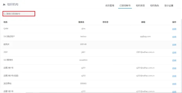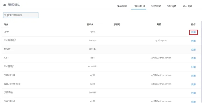 # 已禁用账号 ### 功能说明 用于已禁用账号管理(启用),查询功能 ### 操作步骤 1. 点击启动按钮,可以启用已禁用的账号  2. 启用成功,会提示该用户启用成功  3. 搜索已禁用账号