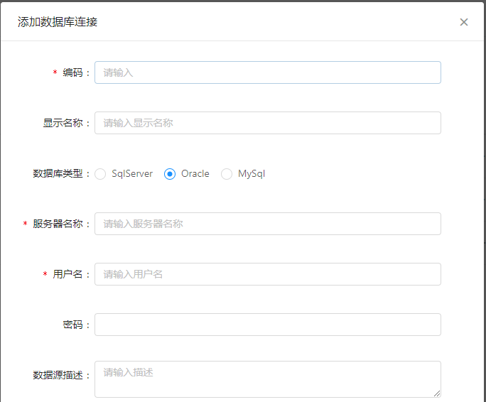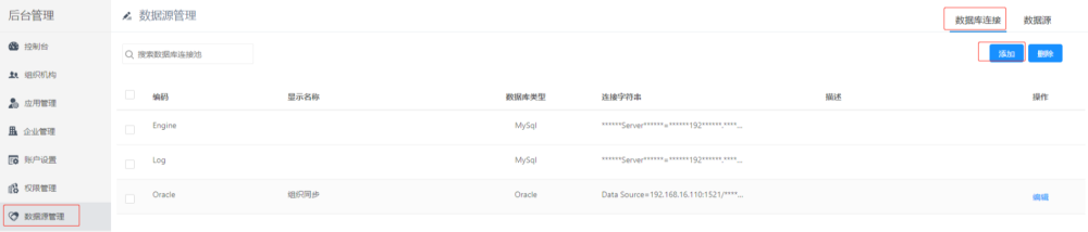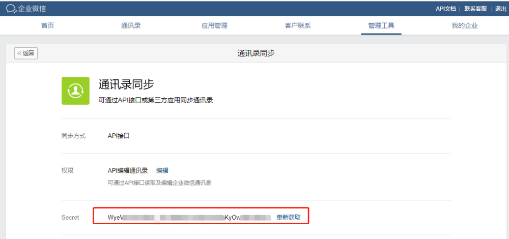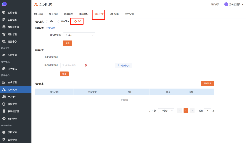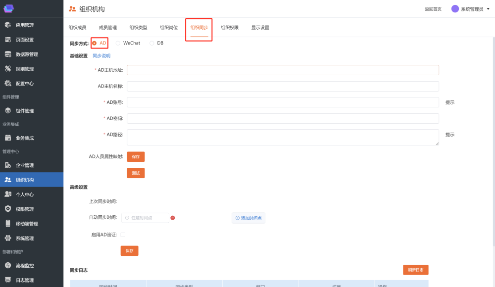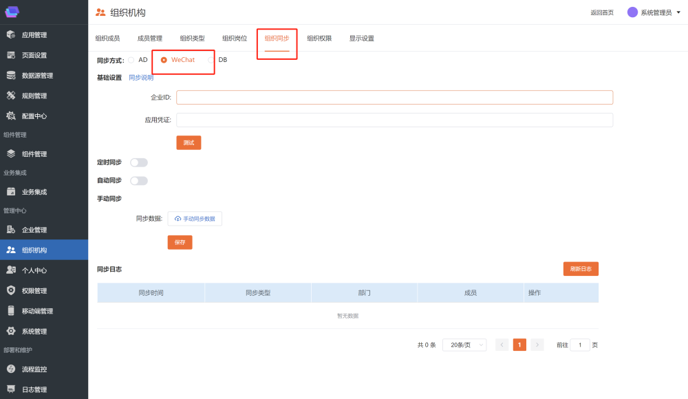 # 同步第三方数据库 同步通过配置可以将第三方数据库的部门和用户数据同步到平台和企业微信中,具体配置如下: ## 数据库表或视图规范 第三方可以提供**数据表或者视图**供平台调用。 ### 部门 表(视图)名称:SYNC\_DEPT 字段: | 名称 | 类型 | 描述 | 是否必填 | 默认值 | | --- | --- | --- | --- | --- | | DeptCode | VARCHAR | 部门编码(唯一标示) | 是 | | | DeptName | VARCHAR | 部门名称 | 是 | | | ParentCode | VARCHAR | 部门父级编码 | 是 | 第一级部门的ParentCode给默认值:18f923a7\-5a5e\-426d\-94ae\-a55ad1a4b240 | | SortKey | INT | 部门排序号 | 否 | 0 | | LastUpdateTime | DATE | 最后修改时间 | 是 | | ### 用户 表(视图)名称:SYNC\_USER 字段: | 名称 | 类型 | 描述 | 是否必填 | 默认值 | | --- | --- | --- | --- | --- | | UserName | VARCHAR | 用户名称 | 是 | | | UserCode | VARCHAR | 用户编码(登录名) | 是 | | | DeptCode | VARCHAR | 用户所属部门编码 | 是 | | | Mobile | VARCHAR | 手机号 | 否 | | | Email | VARCHAR | 邮箱 | 否 | | | OfficePhone | VARCHAR | 办公电话 | | | | IdCard | VARCHAR | 身份证号 | 否 | | | Birthday | DATE | 生日 | 否 | | | EmployeeNumber | VARCHAR | 员工编号 | 否 | | | SortKey | INT | 用户排序号 | 否 | 0 | | State | INT | 状态 | 是 | 1:启用;0:禁用 | | LastUpdateTime | DATE | 最后更新时间 | 是 | | ==**注意:当需要同步数据到企业微信时,Mobile 和 Email 必须要填写一个。**== ## 数据库连接设置 在「系统后台」\-\>「数据源管理」中添加数据库连接,如下图:  点击「新增」按钮  数据库可以支持 \`SqlServer\`、\`Oracle\` 和 \`MySql\` 三大主流关系型数据库。 ## 同步方式设置 在「组织机构」\-\>「组织同步」\-\>中进行相关配置:  * 同步方式:将同步方式切换为 DB * 同步数据库:当同步方式切换为 DB 时,显示同步数据库,可以选择在数据库连接中新增的连接配置 * 自动同步时间:当时间达到设置的时间时,系统后台会进行同步,可以设置多个 ### 企业微信同步设置 ### 平台配置 在「组织机构」\-\>「组织同步」中进行相关配置:  * 企业ID:进入企业微信后台,在「我的企业」页签中进行查找,如下图  * 通讯录凭证:进入企业微信后台,在「管理工具」\-\>「通讯录同步」中进行查找,如下图  ### 企业微信后台设置 进入企业微信后台,在管理工具\-\>通讯录同步界面,将权限设置为:API编辑通讯录  ### AD同步配置 在「组织机构」\-\>「组织同步」\-\>中进行相关配置:  * 同步方式:将同步方式切换为 AD * 填写AD主机名称、地址、账号、密码、路径 * 自动同步时间:当时间达到设置的时间时,系统后台会进行同步,可以设置多个