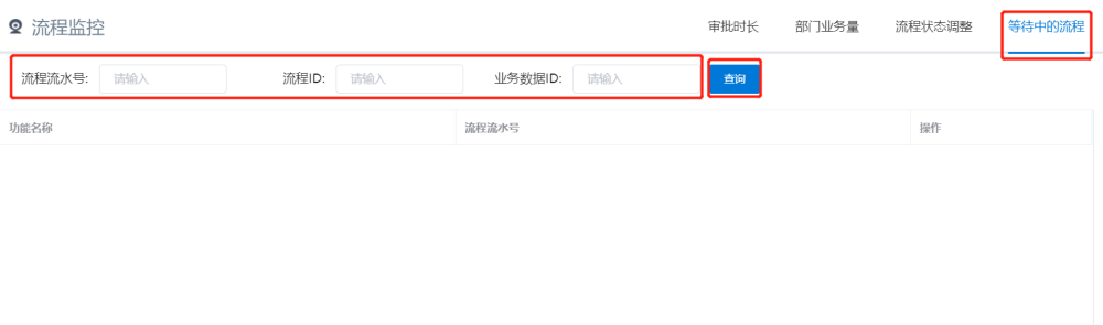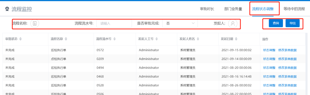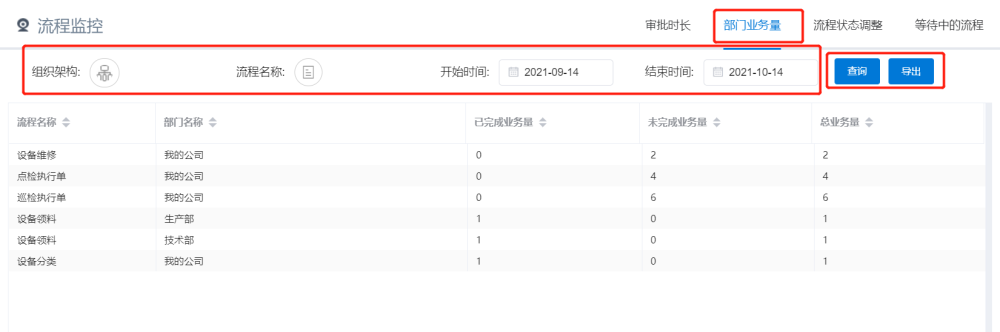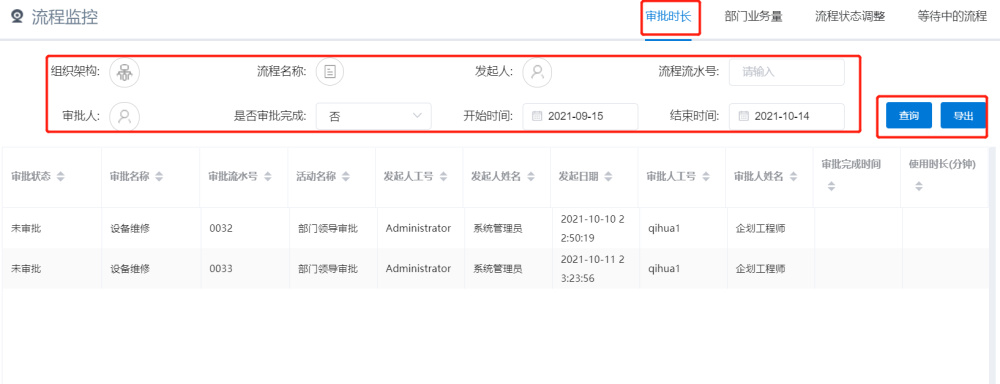 # 流程监控 ## 审批时长 1、查询:通过组织架构、流程名称、发起人、流程流水号、审批人、审批是否完成状态、开始时间、结束时间来进行条件搜索,支持组合、模糊查询 2、导出:可单条或多条数据导出  ## 部门业务量 1、业务量查询:根据组织架构、流程名称、开始时间、结束时间搜索业务量,支持组合模糊查询 2、导出:查询想要的业务量点击导出即可  ## 流程状态调整 1、查询:通过流程名称、流程流水号、是否审批完成、发起人等条件查询流程状态信息  ## 等待中的流程 1、查询:通过流程流水号、流程id、业务数据id等条件查询等待中的流程状态信息