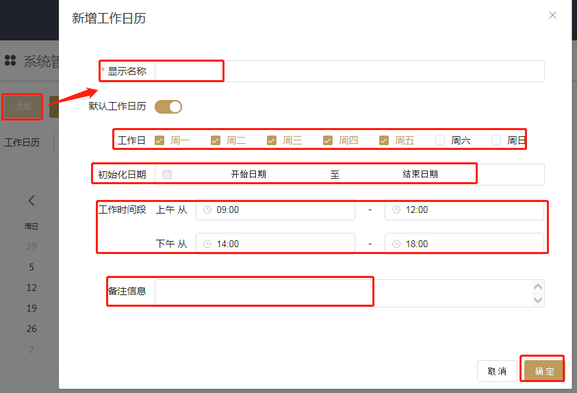 # 工作日历 1、新增工作日历:设置显示名称、工作日、初始化日期、工作时间段、备注信息,点击确认 2、编辑工作日历:可以对显示名称、工作日、初始化日期、工作时间段、备注信息进行修改  2、删除工作日历:切换到想要删除的工作日历后点击删除即可