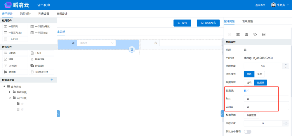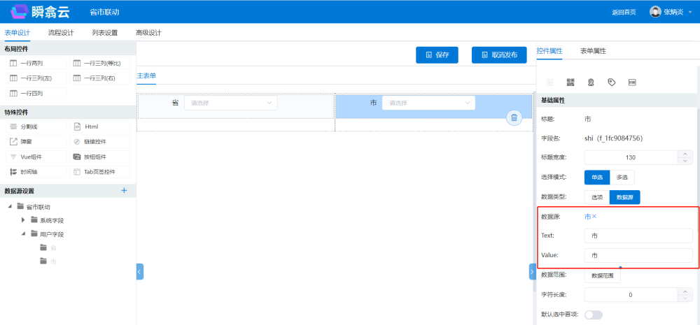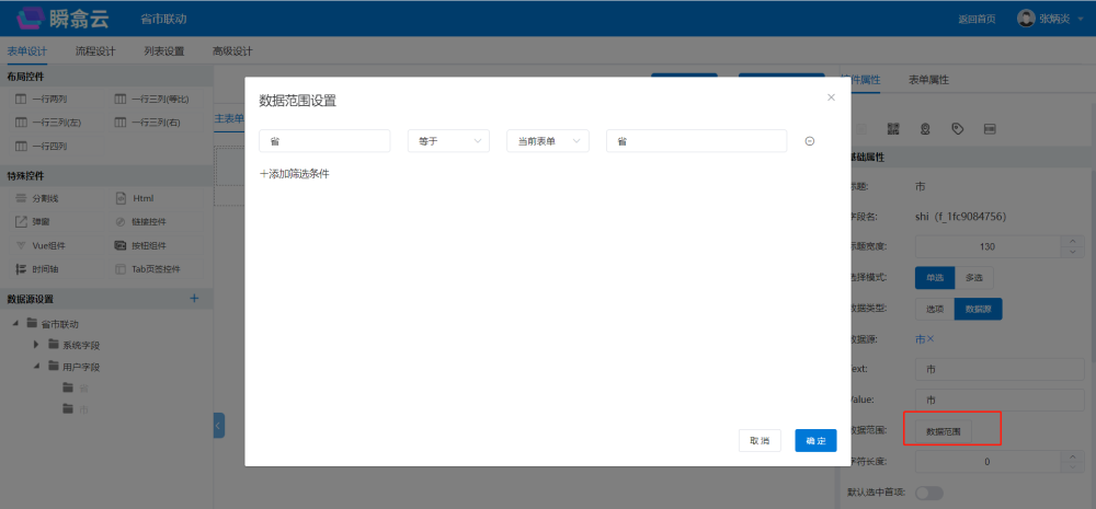 # 多级联动下拉框 # 场景说明: 在一个表单中有实现省市联动,当选择省时,第二个下拉框显示对应市区的内容。 # 操作步骤 1. 创建一个省份表单,添加省份数据  2. 创建一个市级表单,添加数据,市级表单中需要包含 省份名称和市级名称  3. 创建一个省市联动的表单,添加两个下拉框控件,分别命名为“省”、“市” 1. “省”的下拉框,绑定数据源为“省份”的表单  5. “市”的下拉框,绑定数据源为“市”的表单  6. 设置 “市”的数据范围(重点)  7. 效果图: