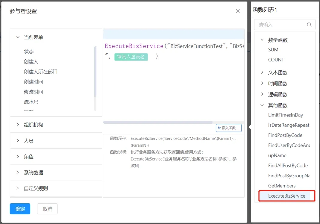 # 函数调用服务 1. 和节点调用服务设置一致,先在业务集成中添加业务服务:录入基本信息,选择http方法,录入第三方系统提供的URL地址,添加入参或出参数据。 2. 创建一个表单应用,切换到高级设计tab页,进入业务方法绑定业务服务 3. 点击编辑,设置映射,选择映射方式Property或Const两种方式;Property方式从表单中选择想要映射的字段;Const方式自己设置映射常量。 4. 设置完成后,入参参数名称和映射对象相关联成功。在流程设计中:1)审批节点设置参与者,参与者设置如图,选择ExecuteBizService函数,括号内数据为业务服务、业务方法名称以及映射对象字段。  5. 审批节点参与者设置完成后,表单前台该字段输入的登录名通过执行绑定的业务服务后即为下一步审批人。