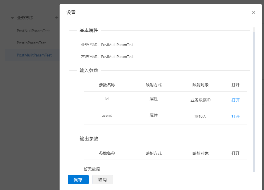 # 示例代码(webapi) 1. Get请求 1) 无输入/输出参数   2\) ==特别说明,由于平台接口的约定,目前只支持无输入/输出参数的Get请求的接口调用== 2、Post请求 1\) 无输入/输出参数   2\) 带一个输入参数,无输出参数   3\) 有多个输入参数,无输出参数    4\) 有输入输出参数    3、==特殊参数值配置== 1\) 当前登录用户ID  2\) 当前流程节点名称