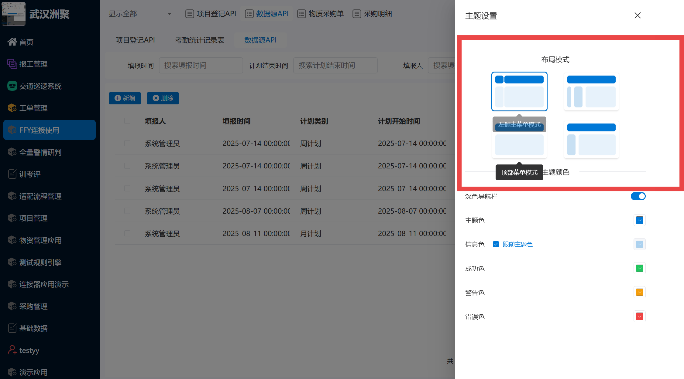## 顶部导航栏的展现形式 * #### 左侧导航栏与顶部导航栏实现联动 * #### 导航栏内容可根据用户角色和权限动态调整