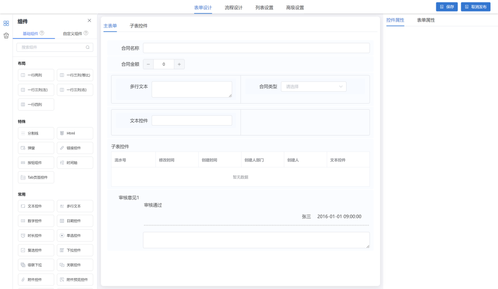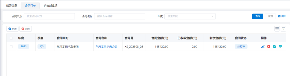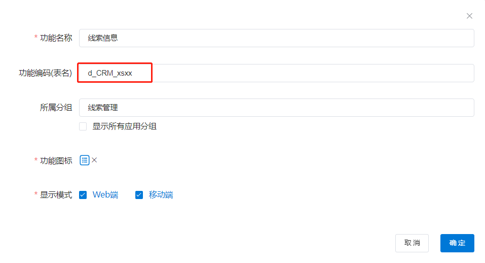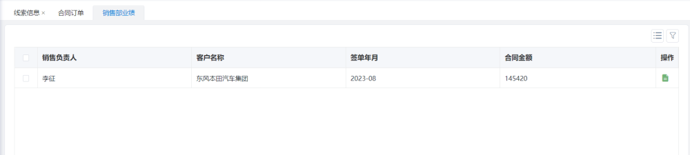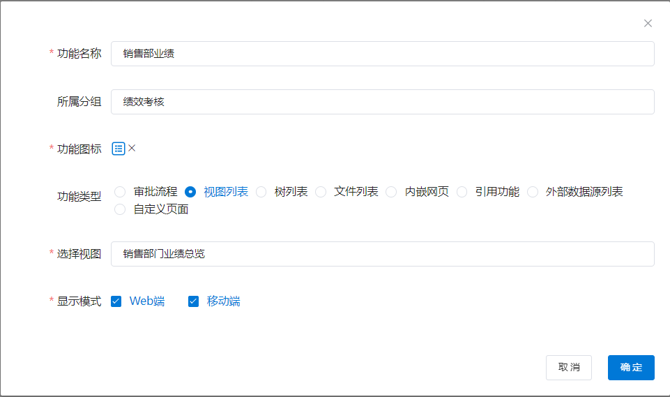 # 新建视图列表 ## 功能说明 通过 后台的 数据源 写 sql语句,将两个或者多个表 联成一个表,展示两个表的数据 制作视图列表涉及以下内容: * 新建两个数据源表 * 新建数据源 ### 创建数据源表 1、进入后台\>应用管理创建新应用  在创建应用界面填写以下内容: * 应用名称:测试应用,也可自由输入(必填) * 应用编码:同步应用名称自动输入 * 应用图标:自由选择应用图标(必选项) * 应用排序:10,可以自由输入大于0的整数值(数值越大应用越靠前) * 显示模式:web端、移动端全部显示,有4种模式根据实际场景任意选择  点击确定应用创建成功 2、创建分组:点击新建分组,分组名称:绩效考核,可自由输入。点击保存分组创建成功  3、新建功能:点击“销售管理”后方“\+”进入“新建功能”界面,填写以下内容: * 功能名称:可自由输入,例如“线索信息”(必填) * 功能编码:无,可以不填(非必填项) * 所属分组:默认“线索管理” * 功能图标:自由选择功能图标(必选项) * 功能类型:审批流程 * 显示模式:web端、移动端全部显示,有4种模式根据实际场景任意选择 点击确定,创建“线索信息”功能成功 再创建一个“合同订单”功能,步骤同上 4、表单设计:进入资产台账“表单设计”界面,添加表单功能:  设置成功后点击保存、发布,“线索信息”表单创建成功,“合同台账”创建表单步骤同上  ### 新建数据源 1、进入后台\>数据源管理\>数据源,点击“新增数据源”,进入新增数据源界面,填入内容如下: * 数据源名称:销售部门业绩总览,可自由输入(必填) * 数据源描述:获取销售部门业绩,可以不填(非必填项) * 数据源sql:SELECT uuid() ObjectID,0 ParentIndex,"" ParentObjectID,"" ParentPropertyName,a.xiaosfzr AS 销售负责人,a.kehxx 客户名称,DATE\_FORMAT(b.qianyrq,"%Y\-%m") 签单年月,SUM(hetje) 合同金额 FROM d\_CRM\_xsxx AS a LEFT JOIN d\_htgl\_xsht AS b ON a.kehxx\=b.kehmc GROUP BY 销售负责人,客户名称,签单年月 ==sql格式为:select \+a.(视图必须字段),a.表1字段 空格 对应字段标题,b.表2字段 空格 对应字段标题 form 表名1编码 as a,表名2编码 as b where a.表1字段\=b.表二字段== 需要显示哪些字段则将字段放在select后面,多个字段用英文逗号隔开 说明:查看表名编码和字段方法如下; 查看表名编码:在分组列表下点击功能名称后方编辑图标   查看字段:进入表单设计界面\>基础组件\>查看字段属性  ## 新建视图列表功能 1、进入功能新建功能界面\>点击新建视图列表,填入内容如下: * 功能名称:销售部业绩(必填) * 所属分组:选择“绩效考核” * 功能图标:自由选择功能图标(必选项) * 功能类型:视图列表 * 选择视图:销售部门业绩总览(必选项) * 显示模式:web端、移动端全部显示,有4种模式根据实际场景任意选择  点击确定创建成功,进入表单设计界面 2、表单设计:  3、列表设置:点击“销售部业绩”(视图)列表设置\>列设置,将需要显示的列勾选上,点击保存即可  ## 前台展示 在“线索管理”与“合同订单”表中填入数据;   视图显示如下  ## 小技巧 此处为语雀内容卡片,点击链接查看:<https://zhouju.yuque.com/iqi57r/lcp/dgqfof>