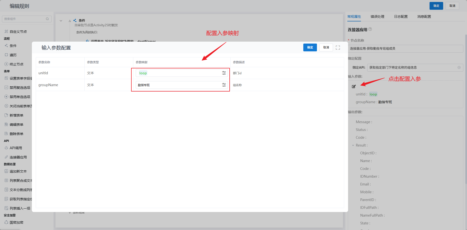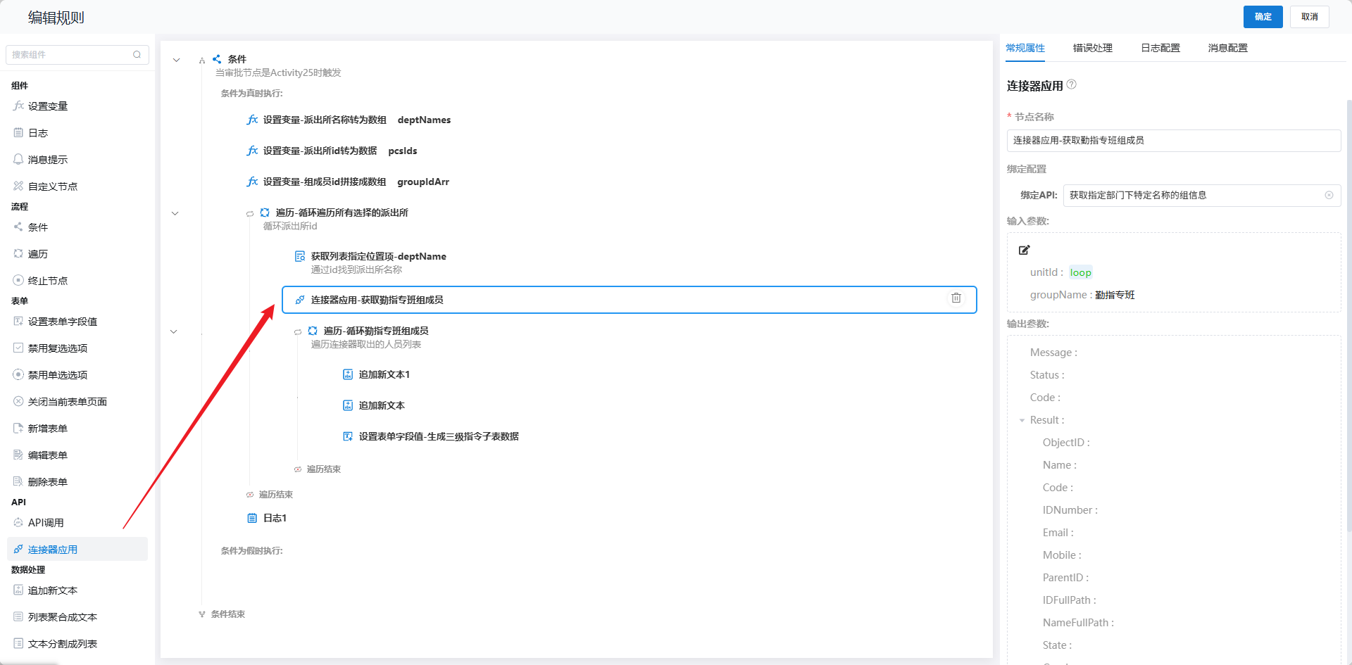 ### 功能描述: 规则引擎集成了一系列可复用的服务组件,如连接器应用能够调用平台功能和第三方API接口。这些组件支持拖拽至画布并配置连接,大大简化了规则设计的复杂性。 ### 操作指南: 1) 在画布界面中浏览并选择需要的服务组件,拖拽到画布上的适当位置。  2) 选择对应连接器,选择对应的api,配置属性面板配置组件的属性和参数。