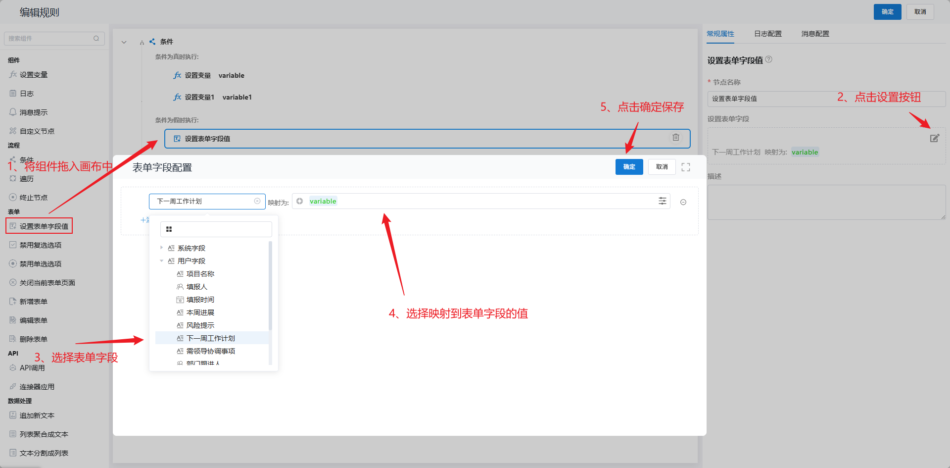 ### 功能描述: 将设置表单字段值组件放入画布中,设置节点名称,选择表单字段和对应映射的内容。执行规则到该节点时,会将映射内容填写到所选择的表单字段上。 ### 使用示例: