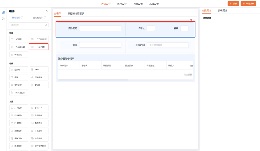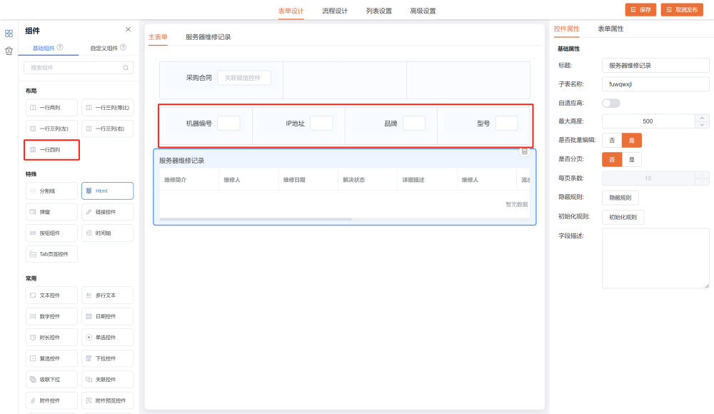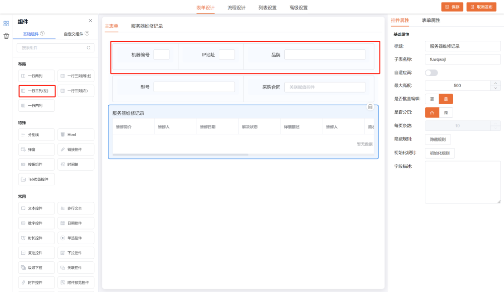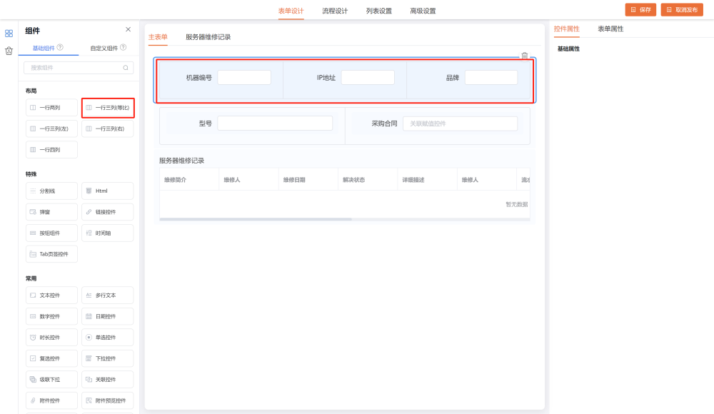 # 一行三列、四列 ## 说明 一行三列是指在表单中,将一行的布局划分为三列,每一列可以添加一个字段; * 一行三列(左):  一行三列(左),前台效果图:  * 一行三列(右):  一行三列(右),前台效果图:  * 一行三列(等比):  一行三列(等比),前台效果图:  # 一行四列 ## 说明 一行四列是指在表单中,将一行的布局划分为四列,每一列可以添加一个字段; * 一行四列:  前台效果图:
