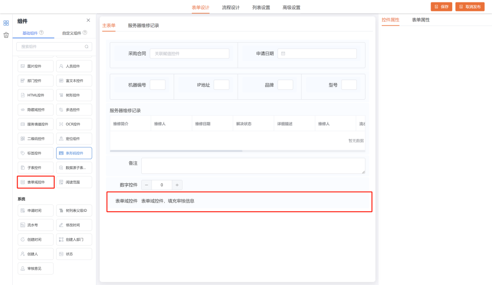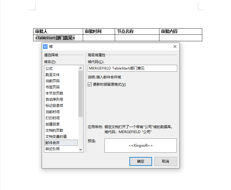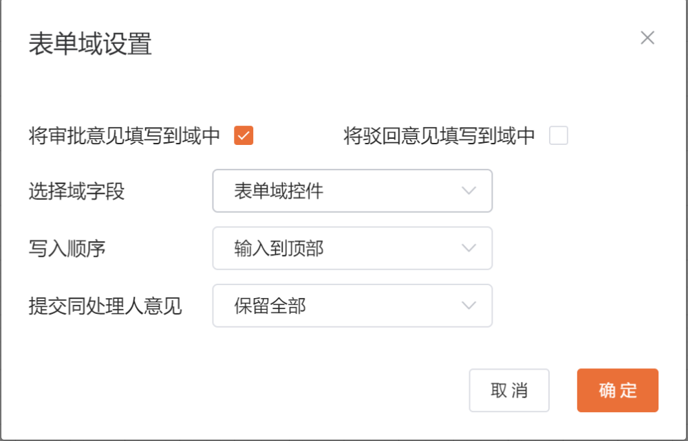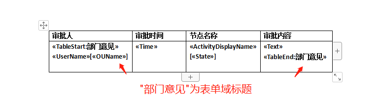 # 表单域 ## 控件说明 用于记录流程节点审批意见,方便用户查看审批记录;表单域不能编辑,只能通过流程节点表单域设置,把审批意见值取到表单域控件中  ## 操作步骤 1、参考2\.1\.3表单搭建,创建数据源\-\>创建字段\-\>拖拽字段到主表中选择表单域控件类型;(注意需要拖拽默认字段审批意见到主表中)  2、切换到流程设计tab页,创建新流程\-\>选择需要设置的审批节点,进入右侧“高级”里面点击打开表单域设置,弹出页默认勾选将审批意见填写到域中,选择创建的表单域字段、写入顺序(顶部或底部)以及提交同处理人意见处理方式(覆盖或保留),点击确定,如图  3、设置完成后,点击保存发布流程,进入前台查看,前台该审批节点填写审批意见提交表单后,该意见会填充到选择的表单域字段中  ## 设置表单域控件打印 1\.在word文档中配置打印字段方法如下: 新建word文档 \- 工具栏点击【插入】\- 【文档部件】\-【域】\-【邮件合并】。如下图设置。  2\.表单域配置成如下,上传至打印。  3\.前台打印效果如下