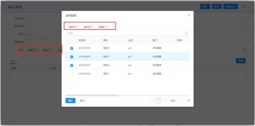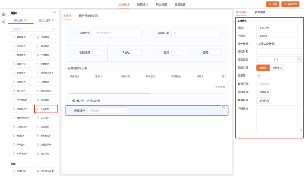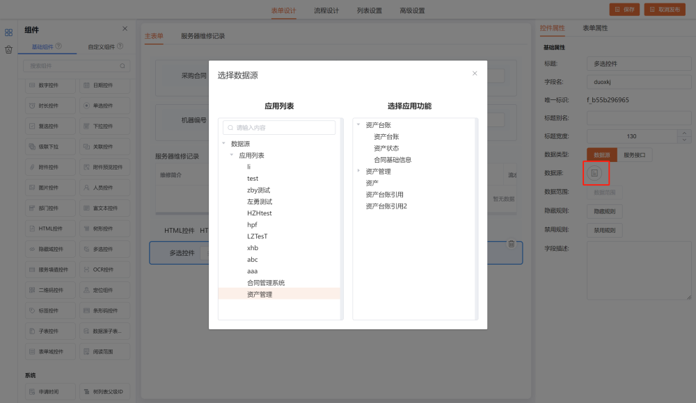 # 多选控件 ## 功能说明 可以通过多选控件对其他表单的数据进行关联,进行直接调用,或者有条件地调用;通过选择需要关联的数据列来关联表单字段,前台支持选择多条数据进行填充。  1\. 关联数据源:选择需要关联数据的表单,同时选择需要关联的数据列字段 2\. 数据范围限定:对关联的表单数据进行范围限定。通过与当前表单控件的数据或某固定值进行匹配,对关联表单的数据进行过滤,在数据选择界面只显示符合限定条件的数据 ## 使用步骤 1、参考2\.1\.3表单搭建,创建数据源\-\>创建字段\-\>拖拽字段到主表中选择多选控件类型,点击数据源弹出选择框,选择需要绑定的数据源,选择数据列,点击保存发布  2、前台查看展示效果:前台表单新增,该字段可从后台绑定的数据源中选取多条数据到当前表单字段中(后台设置的数据显示列选择的单行字段,填充到当前表单中的数据就为单行字段名称)