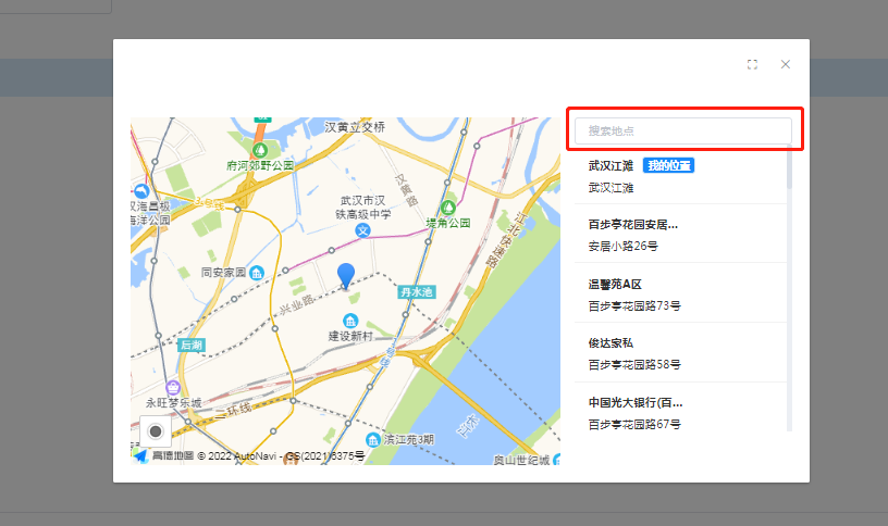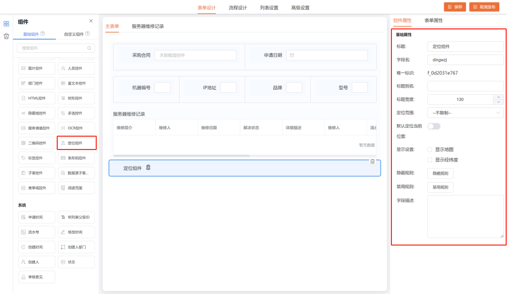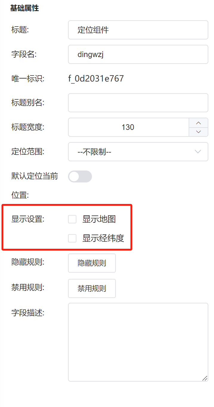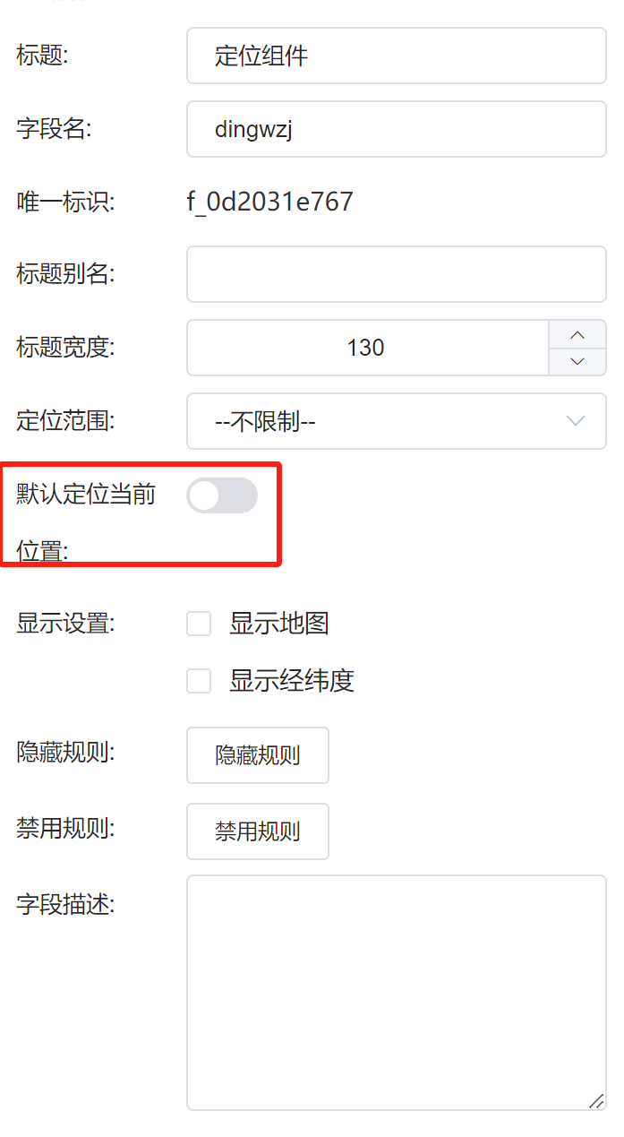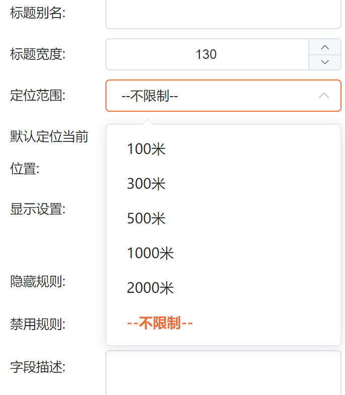 # 定位 ## 一、使用场景 可实现在表单中选择地点位置,多用于移动端,满足定位打卡等需求,也可以满足在表单中以地图形式展示地址的需求 ## 二、前台使用  点击表单上的定位字段,即可进行地点选择。 1、 可自动定位当前地点  2、 可搜索地点 3、 可在地图上直接选择地点,鼠标左键双击地区某地点,即可直接选择该位置 ## 三、后台配置  ### 1、 设置定位范围  管理员设置范围后,表单用户只能在设定的范围内选择地点。 默认为不限制范围,其他可供选择的范围有:100米、300米、500米、1000米、2000米。 例:管理员设置了定位范围为2000米,则表单使用者只能选择当前位置周边2000米范围内的地点。 ### 2、 默认定位当前位置  该开关开启后,表单打开时自动选择当前位置。 ### 3、 显示设置  勾选不同的选项后,表单上控件会自动展示对应的内容 ### 4、 隐藏规则 可设定一定条件下,地图控件隐藏,条件设置方法可参见规则引擎 ### 5、 禁用规则 可设定一定条件下,地图控件禁用,条件设置方法可参见规则引擎 ### 6、 字段描述 可设置对该字段的描述