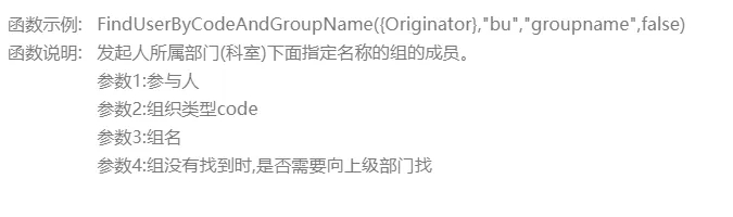 # FindUserByCodeAndGroupName FindUserByCodeAndGroupName({Originator},"bu","groupname") * 函数说明:根据组织类型ID查找此类型下的成员。 参数1: 组织类型ID 参数2: 组织类型code 参数3:类型名称 参数4:组没有找到时,是否需要向上级部门找。例如:没有找到“应急担当”组是,向上级部门继续找“应急担当”