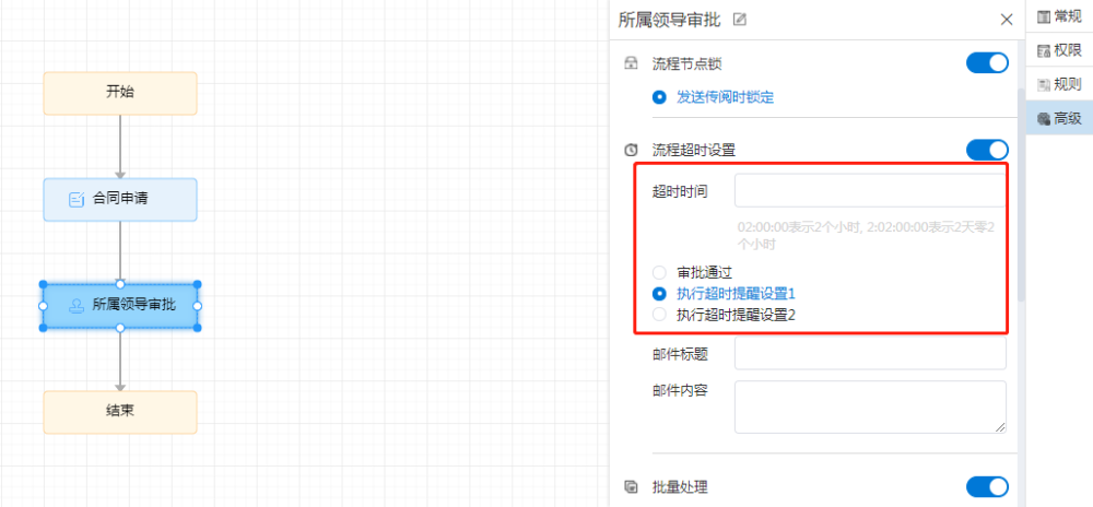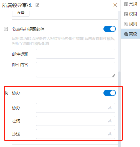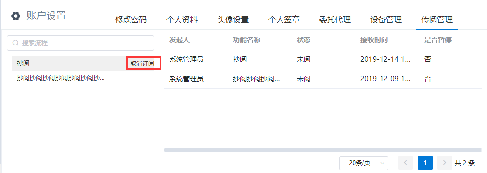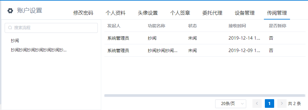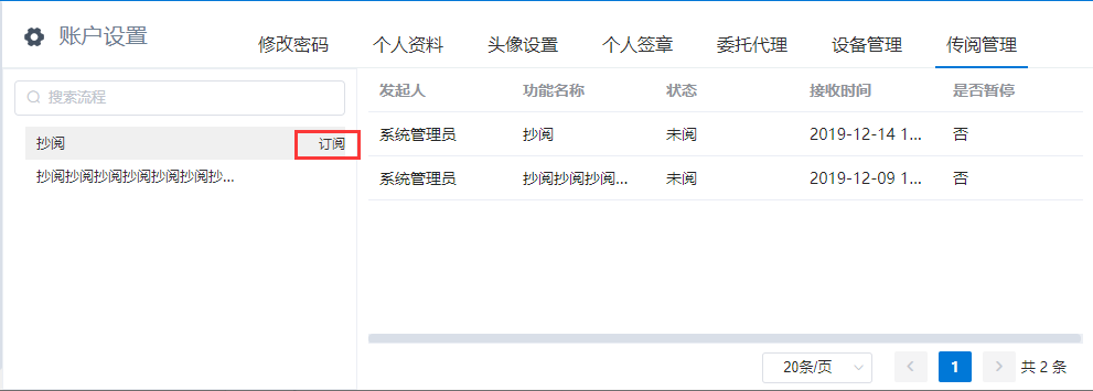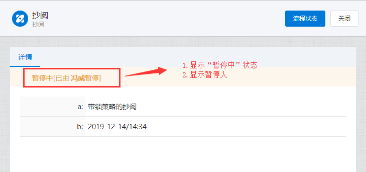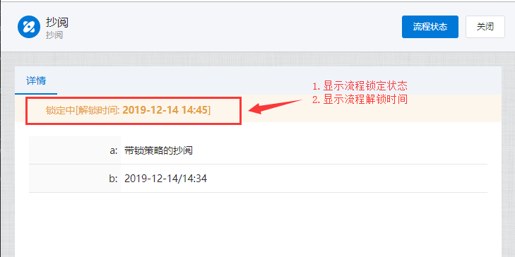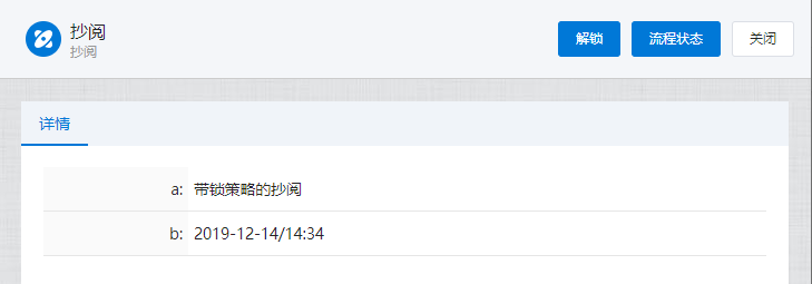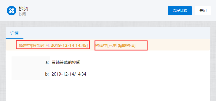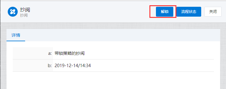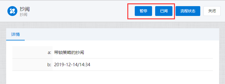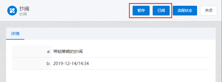 # 抄阅 ## 一、流程抄阅 ### 1\.1、设置抄阅接收人 选中审批节点,在右边停靠栏,\[高级]\-\>协办项中设置传阅接收人。  支持按人员,按组织岗位选择,按自定义规则动态生成抄阅人员。  ### 1\.2、设置抄阅邮件模板 抄阅时,抄阅人在移动端有消息提醒,PC端需有邮件提醒。  ## 二、锁策略的流程抄阅 第一章节简要介绍了流程抄阅的基本功能与设置。带有锁策略的抄阅功能,可以实现被抄阅的领导及业务相关人员实现对流程的暂停和解锁功能。 ### 2\.1、功能介绍 设置了“抄阅锁策略”和“超时时间”的流程节点,在许可时间内,流程处于不可提交状态,审批人在该节点上的表单被锁定。被抄阅人员,可**暂停**流程,只限被抄送节点。 **暂停流程**:被抄阅人表单有“暂停”按钮,流程暂停后;审批人打开该流程节点的待办页面,表单上要显示“暂停”状态,同时控制不能提交。 **解锁流程**:点击了“暂停”按钮的被抄阅人,在待阅表单页面,会显示“解锁”按钮。流程暂停后,只有暂停人员才可以解锁。 ### 2\.2、设置锁策略的抄阅 选中审批节点,在右边停靠栏,高级项中设置“锁策略”和“许可时间”,锁策略选择“发送传阅时执行锁定”。许可时间规定了流程被锁定的时间,以及被抄阅人可以暂停干预流程执行的有效时间范围。 ==注:许可时间的单位为分钟。==  ### 2\.3、被抄阅人暂停流程 流程节点待办人:带锁策略的流程,发起抄阅后,改节点的流程审批人进入待办页面,表单显示锁定状态。  流程节点待阅人:被抄阅人员,显示“暂停”、“已阅”按钮。在许可时间范围内,可暂停流程。  抄阅人点击“暂停”按钮,流程暂停,表单出现“解锁”按钮。  其他抄阅人:被暂停的流程,表单上要显示“暂停”状态,同时控制不能提交。  流程待办人:显示流程锁定状态、暂停状态。  ### 2\.4、暂停人解锁抄阅 暂停人暂停流程后,表单显示“解锁按钮”,如下:  在许可时间范围内,点击解锁按钮,抄阅人的表单恢复初始状态。**这时,其他抄阅人在许可时间范围内也可以抢先暂停流程。**  ### 2\.5、许可时间过期 许可时间过期后,不在出现暂停和锁定状态,流程可以自由流转。 ## 三、抄阅订阅 抄阅人可实现对流程节点的订阅,取消订阅后,**被抄阅人不再接收到该流程所有的抄阅信息**。用户点击“进入后台”,在“账户设置”栏的“传阅管理”页签,可以查看到用户所有的被抄阅信息:  点击左侧已接收待阅信息的流程列表,用户可以“取消订阅”和“恢复订阅”。