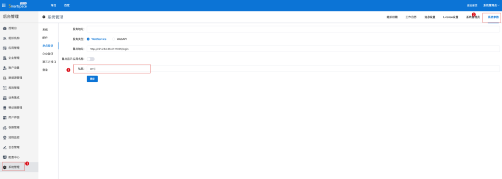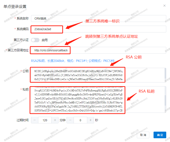 # 单点登录 # Authcode登录 通过authCode自动登录平台 键:authcode 生成方式:Base64(Base64(登录名) \+ PrivateKey \+ Base64(当前日期的年月日格式)) PrivateKey设置如下图:  例: 登录名:administrator 通过Base64加密 \=\> YWRtaW5pc3RyYXRvcg\=\= PrivateKey: wdhac 当前日期: 20191213 通过Base64加密 \=\> MjAxOTEyMTM\= 三个字符串拼起来:YWRtaW5pc3RyYXRvcg\=\=wdhacMjAxOTEyMTM\= 通过Base64加密:WVdSdGFXNXBjM1J5WVhSdmNnPT13ZGhhY01qQXhPVEV5TVRNPQ\=\= URL编码:WVdSdGFXNXBjM1J5WVhSdmNnPT13ZGhhY01qQXhPVEV5TVRNPQ%3D%3D 最终结果: [http://192\.168\.16\.160:90?authcode\=WVdSdGFXNXBjM1J5WVhSdmNnPT13ZGhhY01qQXhPVEV5TVRNPQ%3D%3D](http://192.168.16.160:90?authcode=WVdSdGFXNXBjM1J5WVhSdmNnPT13ZGhhY01qQXhPVEV5TVRNPQ%3D%3D) # 第三方系统配置 > 作为单点登录平台,集成第三方应用,并实现单点登录到第三方系统 > #### 一、概念 业务系统的专业性、系统间为了降低耦合性,单系统被拆分到若干子系统。  #### 二、什么是单点登录 简单来讲,如下图所示,企业用户登录到Portal门户系统,只需要登录一次,就可以访问所有相互信任的应用系统(CRM、Email、ERP等等)。  #### 三、功能设计 **流程图**  #### 三、系统集成 **3\.1 系统配置**登录系统进入后台,点击“系统管理”\-\>“系统参数”\-\>“单点登录”\-\>“第三方系统配置”,“新增”第三方系统配置:  **密钥规格** RSA2公钥私钥,长度2048bit,私钥格式:PKCS\#1,公钥格式:PKCS\#8。 **密钥生成** RSA在线生成,访问[http://www.metools.info/code/c80\.html](http://www.metools.info/code/c80.html)●生成密钥长度为2048,密钥格式PKCS\#1,密钥密码不设置,点击“生成密钥对”。  ●将公钥密钥格式改为PKCS\#8,访问[http://www.metools.info/code/c85\.html](http://www.metools.info/code/c85.html)将以上生成的公钥整体粘贴到如下网址的输入框,选择“公钥”,格式为“PKCS1转PKCS8”,点击“转换”。 **3\.2 集成接口 集成功能 ①** 渲染单点登录的第三方系统列表 **②** 点击第三方子系统链接,获取该系统单点认证路由链接 **认证路径**:回调地址 \+ systemCode \+ token(URL编码)[http://crm.com/sso/callback?systemCode\=crm\&token\=EJyO6nlEvruA5AoS55V9B45smOZAHSIpPOx8adnl%2FA79cIi4Ty8i%2BXDh9rpGl88Z9uD16LQIxpnKxjWBJWiVbQ7bzSzxmUuAbP1ii7EYSY6OYz7qRXhIVhcD2v2F8pfzAeGWEd0fFHSBYc1E8gNeJEBULFBoSbiINIuE5ZDs2Bhl7NeFLhaSde6dsRk1O%2BIYUvf4G4xwIkWvh3cVfjmuXDAj8NmunGBxcdj4Hx9GT2pBiEJ%2FC98ytR1hOaAMB%2FyBr%2FIIgVqhpfX2uWBBpXGLSgHIT0OCSi9LAh5axigGxzJScgQOQ7q1O8E2txzH8DBTgodj9APY6IcI0zBBotMcgA%3D%3D](http://crm.com/sso/callback?systemCode=crm&token=EJyO6nlEvruA5AoS55V9B45smOZAHSIpPOx8adnl%2FA79cIi4Ty8i%2BXDh9rpGl88Z9uD16LQIxpnKxjWBJWiVbQ7bzSzxmUuAbP1ii7EYSY6OYz7qRXhIVhcD2v2F8pfzAeGWEd0fFHSBYc1E8gNeJEBULFBoSbiINIuE5ZDs2Bhl7NeFLhaSde6dsRk1O%2BIYUvf4G4xwIkWvh3cVfjmuXDAj8NmunGBxcdj4Hx9GT2pBiEJ%2FC98ytR1hOaAMB%2FyBr%2FIIgVqhpfX2uWBBpXGLSgHIT0OCSi9LAh5axigGxzJScgQOQ7q1O8E2txzH8DBTgodj9APY6IcI0zBBotMcgA%3D%3D) **③** 第三方系统单点认证登录 **集成接口** ●第三方系统列表 | 接口名称 | api/System/GetThirdParties | | | | | --- | --- | --- | --- | --- | | HTTP方法 | GET | | | | | 入参 | 类型 | 成员 | 含义 | 类型 | | \- | \- | | | | 出参 | BaseResultModel | Status | 0:失败;1:成功;3:异常 | int | | | | Message | 错误提示信息 | String | | | | Code | HTTPCode | String | | | | Result | 第三方系统信息 | List\<ThirdPartyInfo\> | ●获取第三方系统单点认证路由链接 | 接口名称 | api/System/GetAuthCode | | | | | --- | --- | --- | --- | --- | | HTTP方法 | GET | | | | | 入参 | 类型 | 成员 | 含义 | 类型 | | | userCode | \- | 用户登录名 | String | | | systemCode | \- | 第三方系统编码 | String | | 出参 | BaseResultModel | Status | 0:失败;1:成功;3:异常 | int | | | | Message | 错误提示信息 | String | | | | Code | HTTPCode | String | | | | Result | 单点认证路由链接 | String | ●解析认证Token、获取用户信息接口 | 接口名称 | api/OrganizationExt/SSOLogin/{systemCode} | | | | | --- | --- | --- | --- | --- | | HTTP方法 | POST | | | | | 入参 | 类型 | 成员 | 含义 | 类型 | | | token | \- | 认证Token | String ,从body传值 | | | systemCode | \- | 第三方系统编码 | String,从url传值 | | 出参 | BaseResultModel | Status | 0:失败;1:成功;3:异常 | int | | | | Message | 错误提示信息 | String | | | | Code | HTTPCode | String | | | | SSOLoginReponse | Result: 解析结果Message:错误信息UserInfo:用户信息 | booleanstringUserInfo |