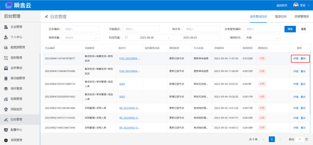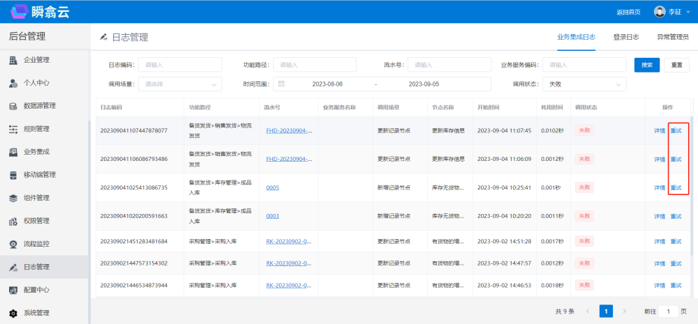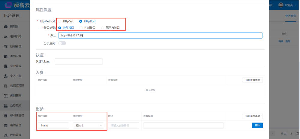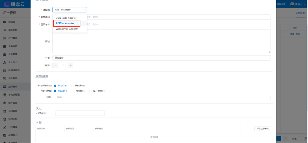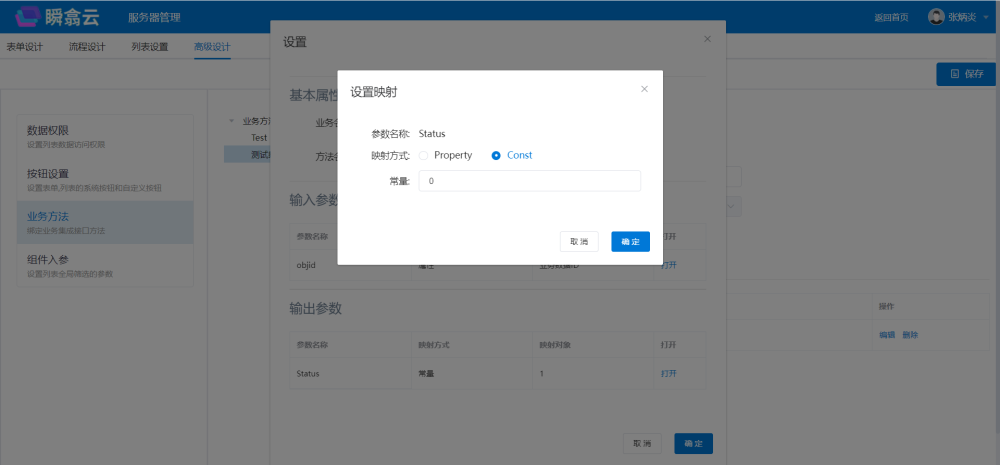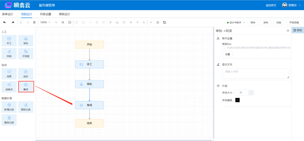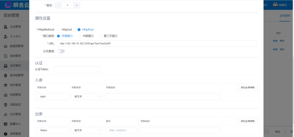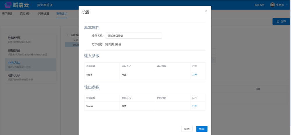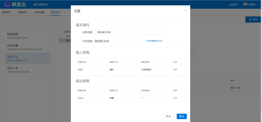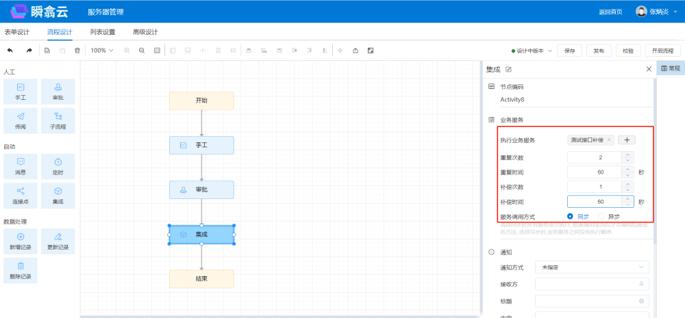 # 接口补偿操作手册 ## 功能说明 * 本功能需要在后台“业务集成”中调用接口 * 主要用在工作流表单的“业务动作”流程节点 * 可以调用单个接口,也可以调用多个接口 * 当接口“重试”和“补偿”失败后,可以用“发邮件”的形式通知相关管理人员 * 接口的操作日志在后台“日志管理”中的“业务方法日志”中可以查看 ## 操作步骤 #### 1\. 在后台“业务集成”配置接口 a. 进入后台“业务集成”,点击“添加”按钮,**适配器**选择“RESTful Adapter”,**HttpMethod** 选择 “HttpGet”  b. 在 **URL**中填写 接口的地址,在 **出参** 中配置 输出参数 的名称,例如下图:  c. 完成后点击保存,接口就配置好了 #### 2\. “业务方法”中,调用接口 a. 点击“功能设计” 进入后台的“高级设计”,找到“业务方法”,点击“添加”按钮,添加一个业务方法  b. 业务方法添加成功后,点击添加的业务方法,再点击“绑定业务服务”,选择“业务名称”(找到在后台“业务集成”中配置的接口),选择完成后,点击 确定 按钮  c. 在“业务方法与服务映射列表”中,点击“编辑”按钮,在弹窗中点击“打开”按钮,选择“**Const**”(自定义模式),在常量框中输入 接口输出参数的值 (例中的接口为Status)  d. 配置完成后,点击“确定”后,点击“保存”按钮,再进入下一步  #### 3\. 进入“流程设计”,调用“业务方法” 进入“流程设计”,拖入一个“集成”流程节点,在右侧属性面板中进行设置  * **业务动作:** 选择在“高级设计”中“业务方法”配置的业务方法 (如果此时业务动作为空,请先将流程保存后刷新页面) * **重试次数/补偿次数:** 设置当接口出现错误时,流程将进行 重试/补偿 的次数 * **重试时间(秒)/补偿时间(秒):** 设置 重试/补偿 次数中间间隔的时间(单位:秒) * **调用方式:** 1. 同步:当调用方式为“同步”时,接口出现错误,流程将进行“重试”和“补偿”,流程不会往下走; 当接口数量为多个时,第一个接口出现错误时,将不会调用第二个接口 2. 异步:当调用方式为“异步”时,接口出现错误,流程将进行“重试”和“补偿”,流程会往下走; 当接口数量为多个时,多个接口将同时启动,不论接口是否错误,流程都会往下走 * **补偿完成后激活下一节点:** 1. 当选择“是”时,接口参数在补偿阶段,将参数修改正确,补偿完成后,流程将继续往下走 2. 当选择“否”时,接口参数在补偿阶段,将参数修改正确,补偿完成后,流程将不会往下走 * **通知方式:** 当接口出现错误时,可以通过邮件等方式将消息发送给相关人员 * **接收人:** 可以设置为“组织机构”里的人员 * **消息标题:** 设置通知消息的标题(无需双引号) * **消息内容:** 设置通知消息的内容(可以使用表单中的字段) #### 4\. “日志管理”中的“重试”按钮 当接口参数出现错误,在规定的“重试”和“补偿”次数结束之后,再将参数修改正确,可以到后台“日志管理”中的“业务方法日志”点击 对应的操作日志 后边的“重试”按钮,进行重试启动“重试”和“补偿”  ## 案例 #### 单接口 ##### 案例说明 * 设置一个单接口的流程,调用方式为“同步”,将接口的参数设置为错误 * 在规定的“重试”和“补偿”结束之后,系统将以邮箱的形式发送一条通知,报告“重试”和“补偿”失败,需要手动修改参数 * 收到邮箱通知之后,手动将参数修改正确,点击“日志管理”里的“重试”按钮,流程将继续往下走 说明:接口的URL为:[http://192\.168\.16\.162:5300/api/Test/TestGetIP](http://192.168.16.162:5300/api/Test/TestGetIP) 接口的参数为:Status : 1 1. 在后台“业务集成”中添加一个“业务方法”,调用接口,业务方法的名称为“satus1”  2. 到表单的“高级设计”中,添加业务方法,将接口名称命名为“接口测试”,将接口的参数修改为 0 (接口的正确参数为 1),点击保存  3. 到流程设计中,在“**业务动作**”流程节点中添加业务方法“接口测试” **重试次数/补偿次数** 分别设置为3次和2次 **重试时间/补偿时间** 分别设置为5秒和10秒 **调用方式**为“同步” **通知方式**设置为“Email” **接收人**设置为“小管理”(接收人的信息里需要有邮箱地址) **消息标题**为“接口补偿失败”, **消息内容**可以引用表单中的字段,也可以自定义,在本例中,设置的是表单中的字段  4. 发起一个流程,当流程节点流转到“业务动作”时,查看“日志管理”,当接口在规定时间内“重试”和“补偿”完成后,将会收到系统发过来的邮件  5. 将参数修改正确  6. 点击“日志管理”中的“重试”按钮  7. 重试成功,流程继续往下走