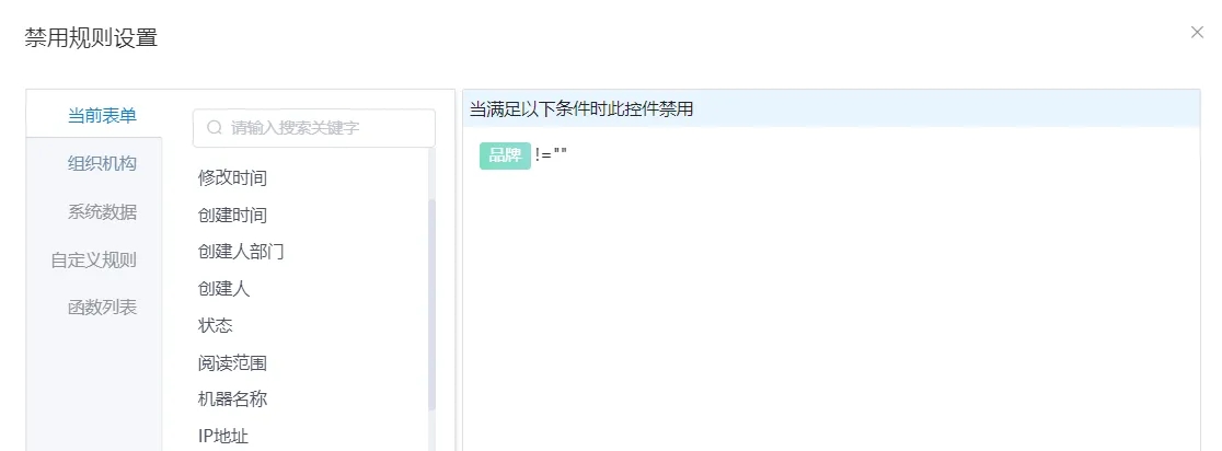 # 禁用规则 ### 功能说明 主表单中任一控件设置禁用规则,设置禁用条件,当满足该禁用条件时会禁用; 例:主表单中有单行文本、多行文本、数字、单选、人员等字段,设置“单行文本”字段禁用规则,禁用规则设置框左侧为可设置禁用条件数据,包含当前表单、组织机构、人员、角色(取组织角色)、系统数据、自定义规则  * 选择“当前表单”字段设置“单行文本”禁用规则:把左侧当前表单中“单选”字段选到右侧,设置禁用条件:单选=="选项1",当前台表单数据新增“单选”字段选择“选项1”时,“单行文本”字段会禁用。也可通过选择组织机构、人员、角色、系统数据、调用自定义规则设置禁用条件 * 通过函数设置“单行文本”字段禁用规则:通过“单选”字段设置禁用条件,当单选等于设置的选项时,单行文本字段禁用,函数设置为:contains({单选},'选项')。当单选不等于设置的选项时,单行文本字段禁用,函数设置为:!contains({单选},'选项')。 #### 默认值 主表单中任一控件设置默认值,选中控件点击默认值,打开默认值设置框,输入内容后确定保存,前台表单新增时该控件自动取值 1. 数字控件设置默认值: 规则设置: 100 1. 文本控件设置默认值: 规则设置:"你好" 1. 多选框设置默认值: 规则设置:"选项1,选项2" ### 实例说明 行政公章: 科长发起“原件已签批”默认勾选科长已批 部长发起“原件已签批”默认勾选科长已批、部长已批 秘书科科长发起“原件已签批”默认勾选科长已批、秘书科科长已批 函数:Contains({Originator.OUFullName}, "秘书科")&& Contains({Originator.OU Post}, "科长")?"科长已批,秘书科科长已批": ( Contains({Originator.OUPost},"部长")?"科长已批,部长已批" : (Contains({Originator.OUPost},"科长")?"科长已批":""))