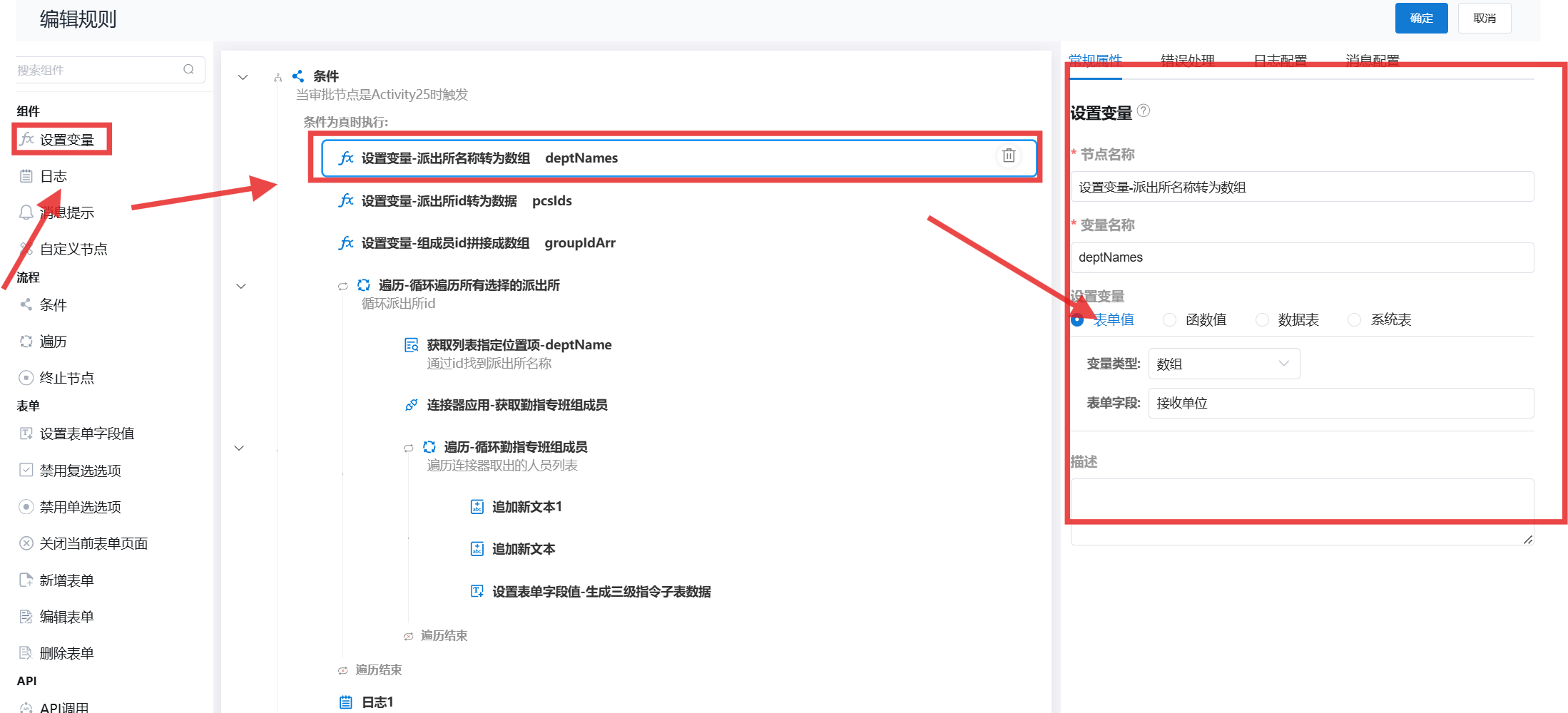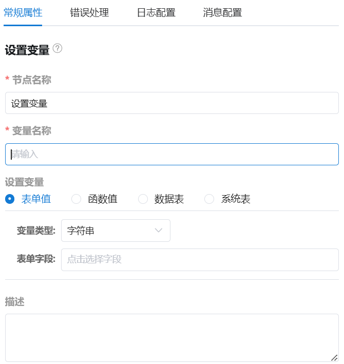## 1.常规属性  * #### 节点名称:对此节点命名 * #### 变量名称:创建一个变量名称 * #### 设置变量:对变量设置一个属性 * ##### 表单值:选择需要的类型以及表单字段 * ##### 函数值:选择需要的类型以及变量值(可以选择节点变量、当前表单字段、系统数据字段以及函数方法) * ##### 数据表:可以选择本平台中已有的需要的表单(选择项中,可以选择表单的具体值、单行记录、多行记录或者行数) * ##### 系统表:可以选择本系统中已有的需要的表单(选择项中,可以选择表单的具体值、单行记录、多行记录或者行数) ## 2.使用示例  #### 设置逻辑:设置一个名称为——‘deptNames’的变量,此变量为数组类型对应表单字段——‘接收单位’